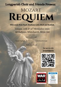 The Longparish Choir and Friends invite you to a special fundraising concert at All Hallows, Whitchurch, on Friday 14th and Saturday 15th November at 7.30pm. The centrepiece of the evening is Mozart’s famous Requiem, performed under the direction of Jack Swanborough, with soloists Stephen Preece, Susan Urquhart, Jack Swanborough and Lydia Swanborough, accompanied on the organ by Robin Smallwood. The programme also features exquisite choral works by Lotti, Bruckner, and Fauré, alongside a flute trio performing Gluck and a mesmerising piece by Herman Beeftink. Tickets are £15 available online at https://tinyurl.com/mozartwhitchurch